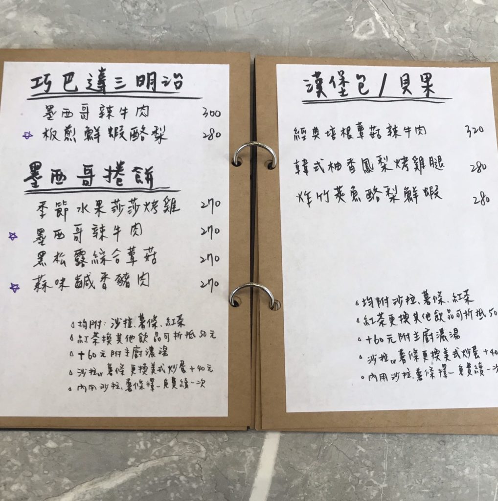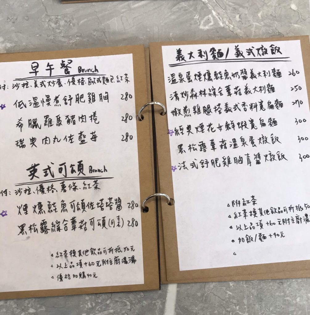 ▲菜單MENU 有義大利麵、燉飯、墨西哥捲餅、貝果、可頌多種選擇,前面有打✡號都是老闆推薦菜唷,每人低消一項餐點或飲品,不需收10%服務費唷