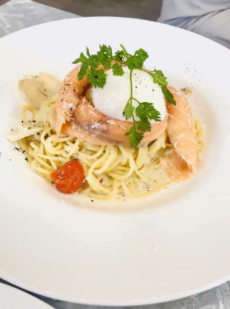 ▲溫泉蛋煙燻鮭魚奶醬義大利麵260元