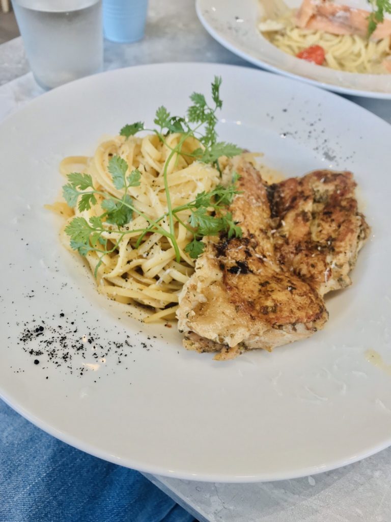 ▲嫩煎雞腿搭義式香料寬扁麵270元