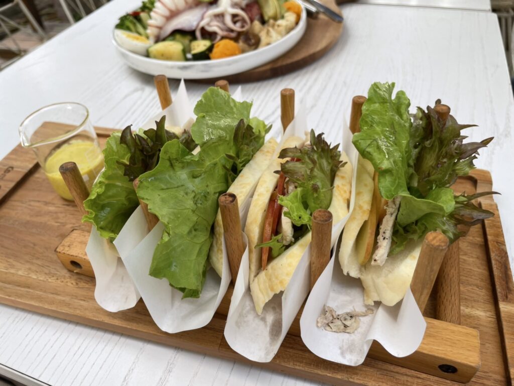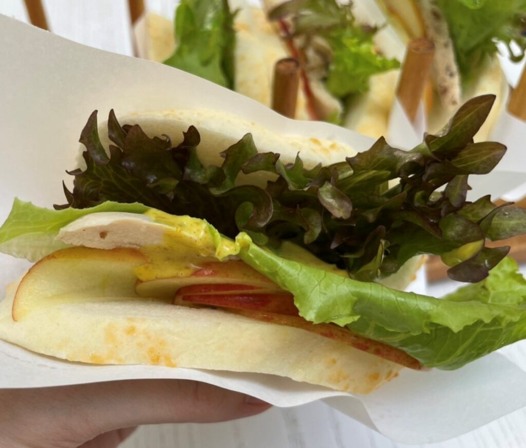 長法有雞、豬、牛三種肉,我們點的是香草嫩雞長法輕食,擺放方式蠻特別的,也很方便拿取,醬還有另外的容器擺在托盤上,要多要少自己淋,吃起來類似優格酸酸甜甜的口感,麵包沒有烤過,非常鬆軟,搭配生菜、蘋果、雞肉,整體很健康的ㄧ道料理,優格醬就算淋多了也不膩口,雞肉雖然是水煮的,但沒有任何腥味,很適合減脂的人食用。