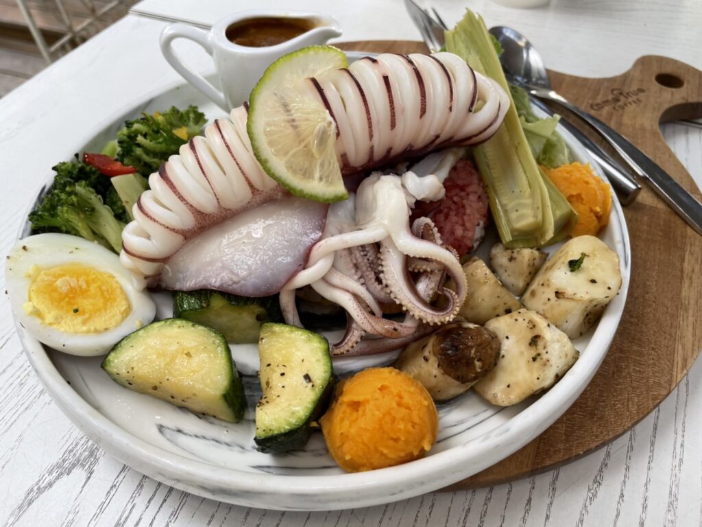 海鹽蒸烤鮮中卷彩虹飯,這道彩虹飯內容很豐富,一隻大中卷在中央不說,周圍還擺滿了各種蔬菜,櫛瓜、花椰菜、帶殼玉米筍,還有半顆水煮蛋及少許南瓜泥,吃起來真的既有飽足感又健康,使用海鹽蒸過的中卷,簡單的調味就吃出中卷的新鮮,如覺得不夠味,盤上也有附醬料,自己斟酌加多少,彩虹飯應該是用紅麴染的色,加上白飯堆疊,蠻Q的,創意度十足的ㄧ道料理。