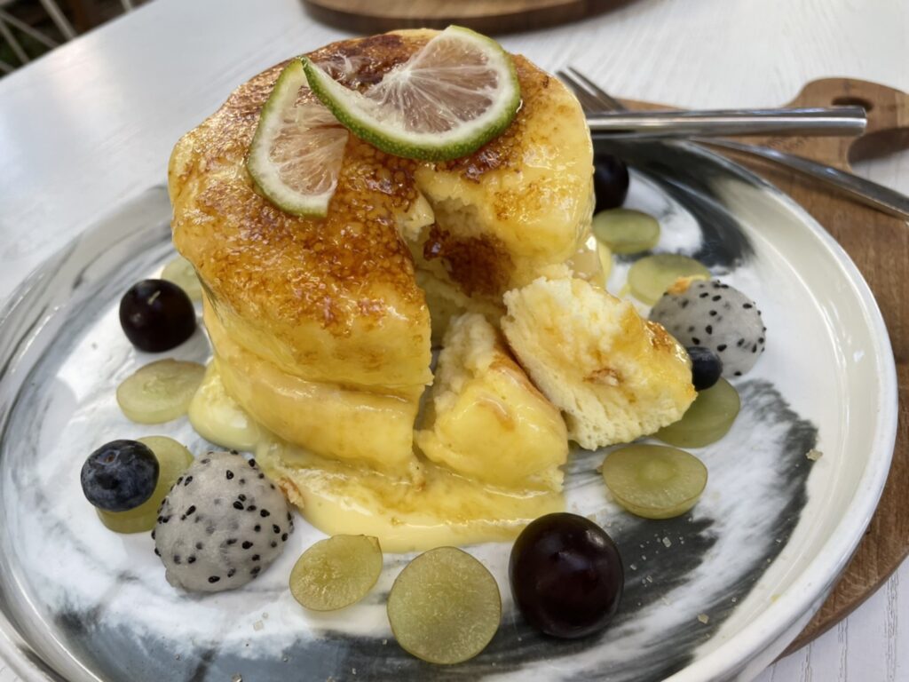 舒芙蕾厚鬆餅-季節水果,雖然不是第一次吃舒芙蕾,但是這真的很美味。鬆餅非常厚但保有一定的濕潤度,吃起來有別於傳統的鬆餅,還淋上了特別檸檬風味醬,酸酸甜甜搭配ㄧ旁的新鮮水果ㄧ掃而空。