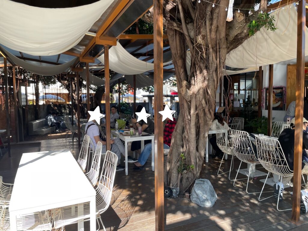 中午時刻戶外座位區人還不算多,但室內座位幾乎已滿。天氣涼爽加上有微微的風吹拂而來,感覺蠻悠閒的,我們就選擇了戶外座位。