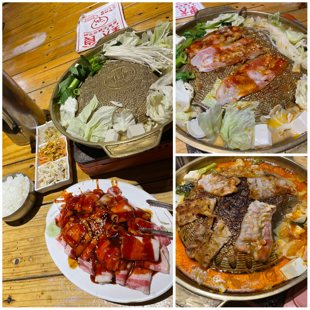 一入座就會送上小菜以及銅盤烤肉要用的器具以及後面要加的湯還有附一碗飯,今天點的是牛肉分量很夠,幾乎每片肉都有醬附在上面,照片為前、中、後的樣子是不是越看越想吃。