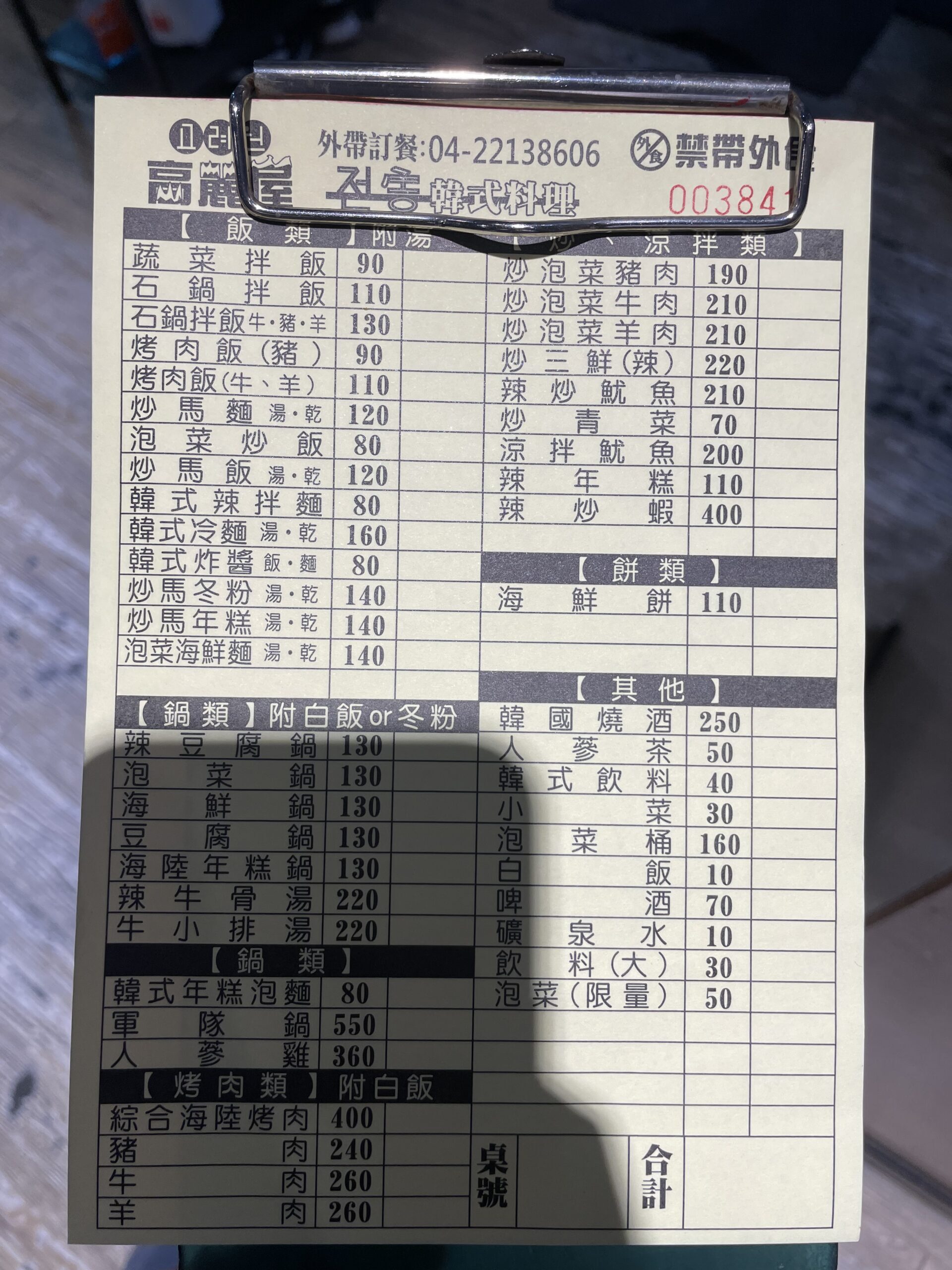 菜單一目了然,常聽到的炒馬麵、炸醬麵、炒年糕、海鮮煎餅以及銅盤烤肉都有,比較厲害的辣炒章魚或是牛骨湯也都少不了。