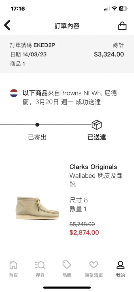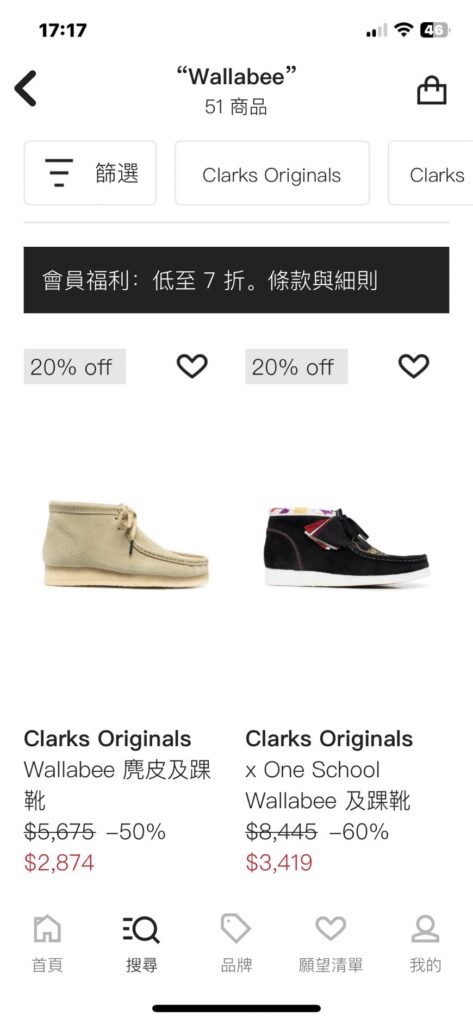 這次購買的是英國知名品牌Clarks下流行的Wallabee袋鼠鞋(靴).查價格時Google跳出在Farfetch有特價,且價格只要不到三千新台幣,MOMO購物網上的價格打折後為6XXX.就下載App後在上面瀏覽下標.